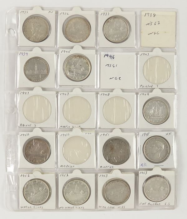 Outstanding collection of fifty cents and dollar issues, Includes 22 early Canadian 50 Cents, Queen Victoria to King George V issues, beginning with 1871 to 1934 in mostly VG to Choice Fine condition; King George VI half dollars, 1937 to 1952, with a number of date varieties included, condition, VF to Uncirculated; 1953 to 2002, 50 cents, Queen Elizabeth Issues, XF to CU and some proof issues; Silver Dollar issues include 1935 and 1936, King George V, AU to Unc; King George VI issues, 1937 to 1952, VF to Uncirculated; Queen Elizabeth issues, 1953 to 2004, XF to CU condition with some later proof-like coins; and, ending with a selection of $2 coins, dated 1987 to 2017. Over $75 of $80 face of 80% to 92% silver issue. Excellent lot that is sure to include surprises for the lucky buyer. Sold "As is", no returns accepted (180+ coins). (photo on web site)