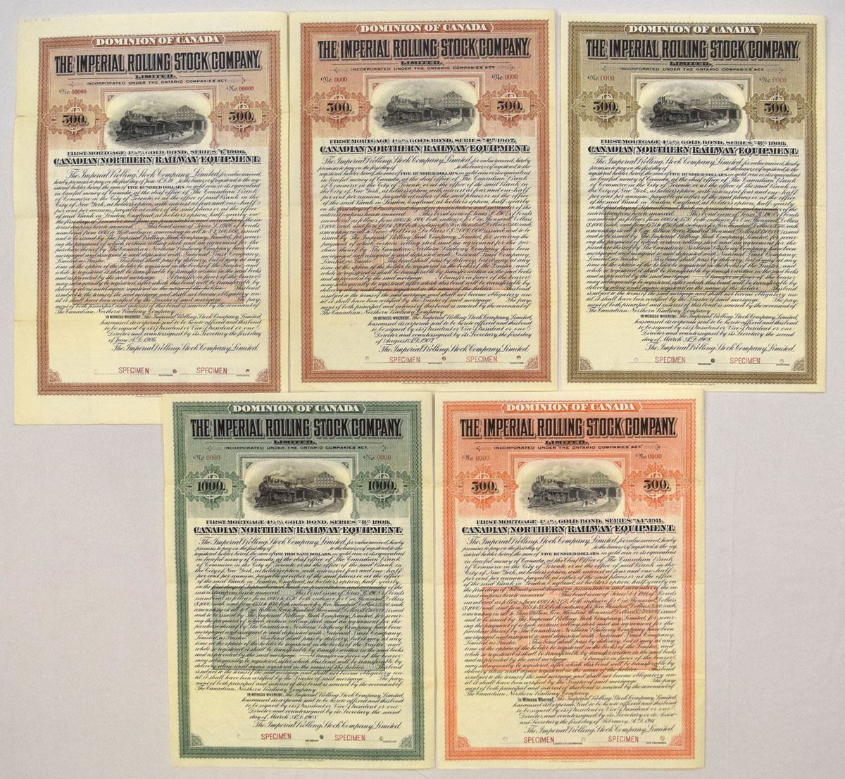 Canada, 1906-11. Lot of 5 Specimen Coupon Bonds, Includes: 1906 $500 4 1/2% with red/brown border; 1907, $500 4 1/2% with red/brown border; 1908, $500, 4 1/2% with brown border; 1908, $1000 4 1/2% with green border; 1911, $500 4 1/2% with orange border. Bonds would have been used finance Canadian Northern Railway equipment, Bonds all have Specimen overprints and POCs, and range from UNC to Gem UNC condition. ABNC. (5). Sold "AS IS" no returns accepted.