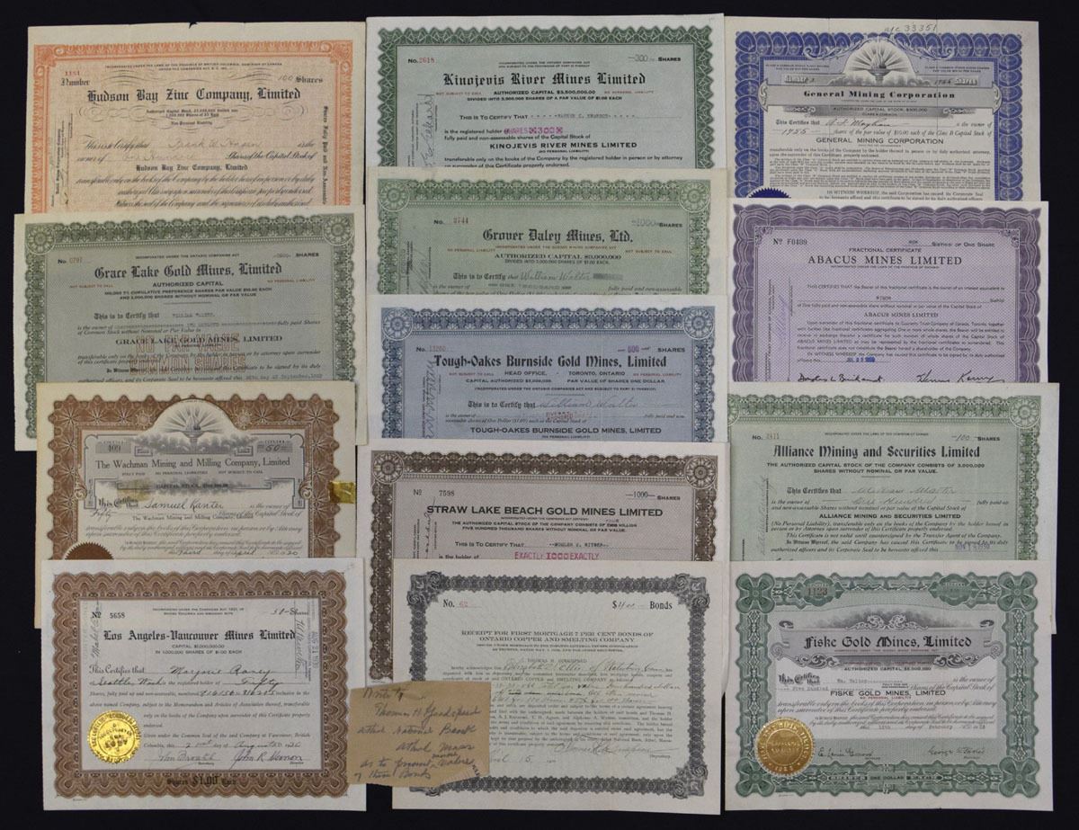 Canada, 1910-1959. Lot of 13, I/U Stock Certificates, Includes: Hudson Bay Zinc Co Ltd; Kinovers River Mines Ltd; General Mining Corp; Grace Lake Gold Mines Ltd; Grover Daley Mines Ltd; Abacus Mines Ltd; Tough-Oakes Burnside Gold Mines Ltd; Alliance Mining and Securities Ltd; Watchman Mining and Milling Co Ltd; Straw Lake Beach Gold Mines Ltd; Benefit Fire Proof Mortgage Bond (Canada); Los Angeles–Vancouver Mines Ltd; Fiske Gold Mines Ltd. A diverse early 1900s group of Canadian and western mining companies featuring attractive border styles, embossed seals, and classic engraved and lithographed vignettes. Conditions range from Good to VF overall with typical folds, toning, and wear. (13). Sold “AS IS” no returns accepted.