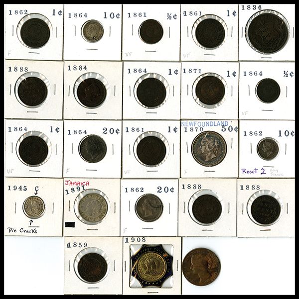 Canada, New Brunswick, Newfoundland and Nova Scotia, Mostly. Canada - 1859-1888 Cents(6) F-VF, one encased; New Brunswick - 1861 & 1864 Cents Fine, 1862 & 1864 Dimes, both Fine details, holed; 1862 Twenty Cents About Fine, 1864 F-VF; Newfoundland 1870 Half Dollar Fine, 1845 Dime AU; Nova Scotia 1861 & 1864 1/2 Cents VF-XF; 1861 Cent Fine, 1862 Cent VG, 1864 Cent VF, 1856 Penny Token AG; Also included - Guernsey 1834 8 Doubles Good; Jamaica 1891 Half Penny Fine. [20+]