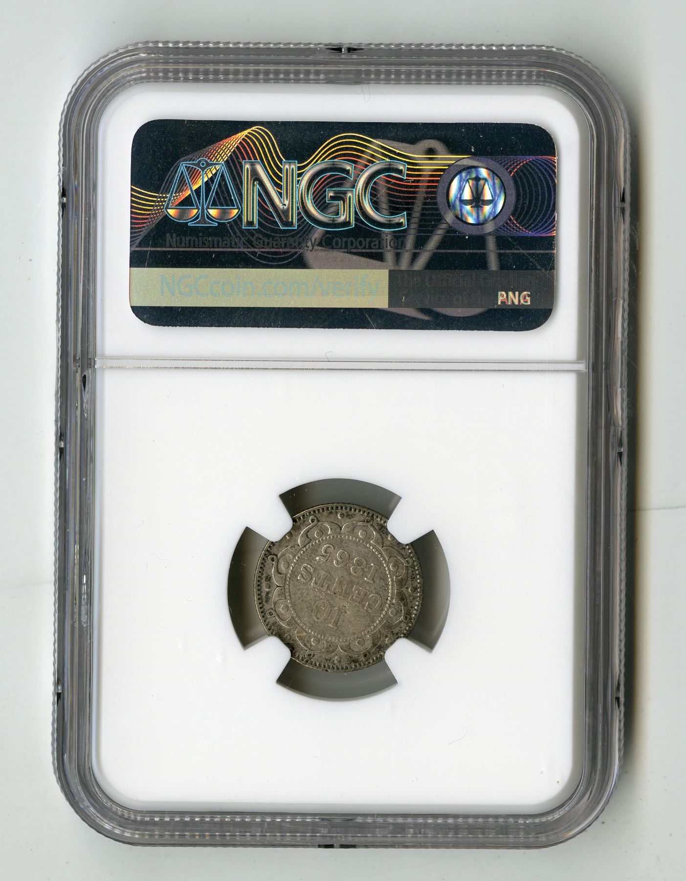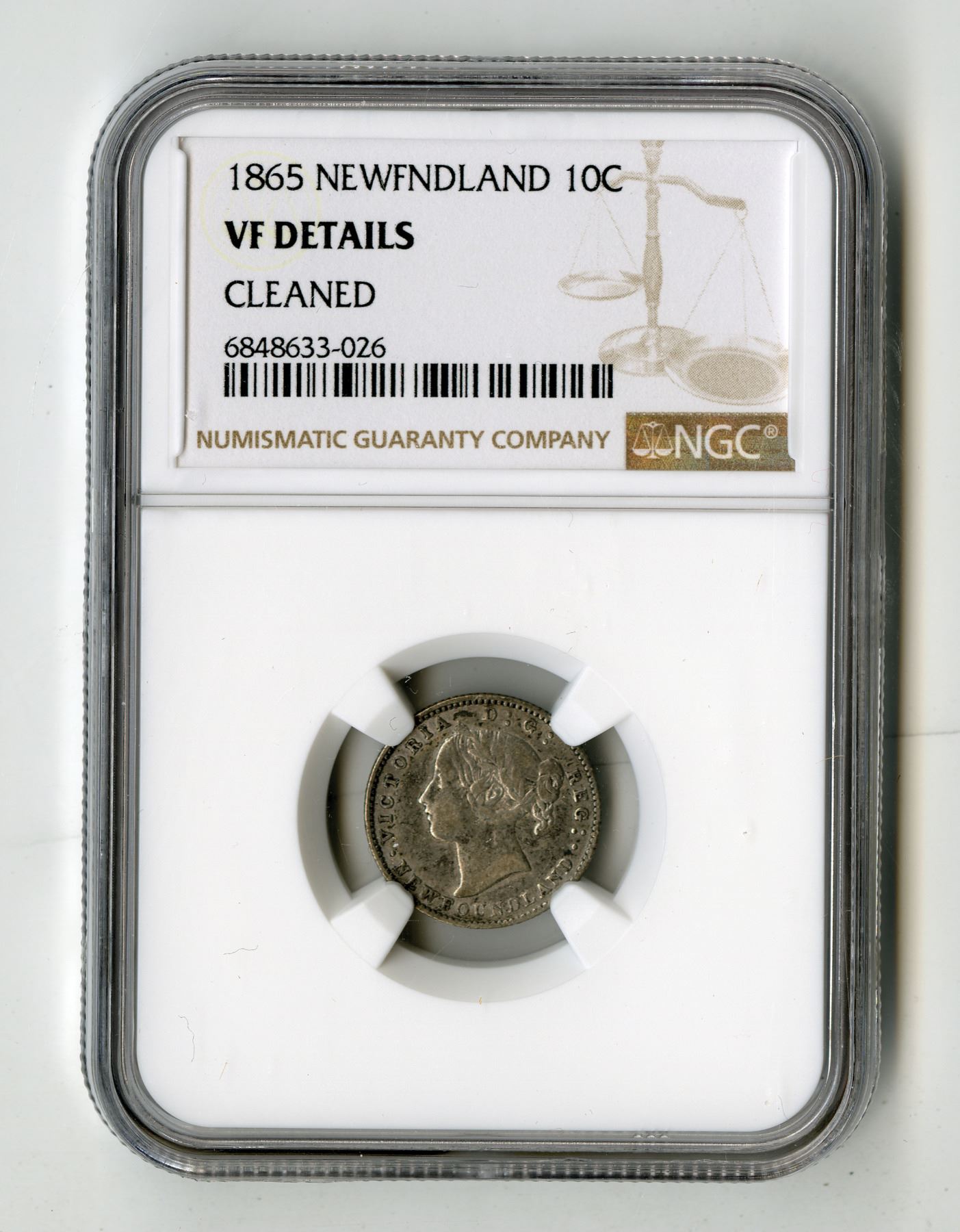 Canada: Newfoundland. 10 Cents, 1865; KM-3, silver, Royal Mint. NGC VF Details with comment "Cleaned". Queen Victoria. Attractive provincial coin with fully visible details.