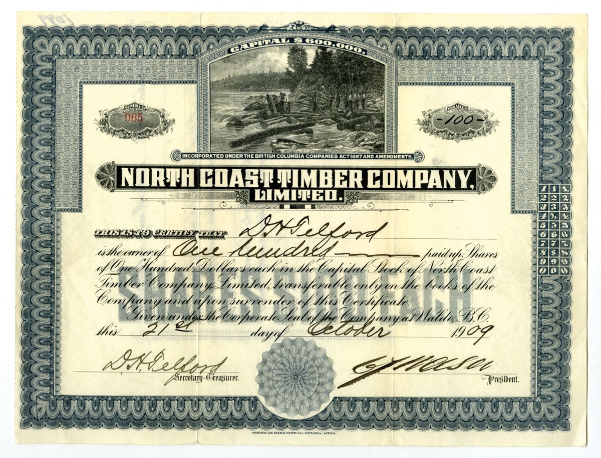 British Columbia….., Canada, 1909. 100 Shares Capital Stock I/U Certificate, Black print with blue border and underprint, Logging vignette at top center above company title, S/N 065, VF to XF condition. ABNC.