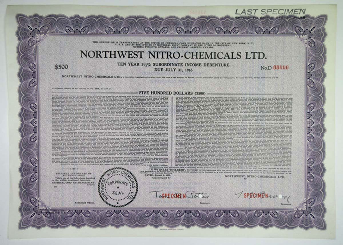 Canada. Northwest Nitro-Chemicals Ltd., 1955 Specimen 5.5% Subordinate Bond, VF. $500 Specimen 5 1/2% Subordinate Income Debenture. Printed by ABNC. Northwest Nitro Chemical Ltd., the first phosphate fertilizer manufacturer on the prairies, began their initial planning stages for the erection of a local chemical plant in 1950. A site, on the Box Springs Road in the Brier Park Industrial area, northwest of the city centre, was selected in 1954. A ground breaking ceremony was held in 1955, and would lead to the building of a $22 million facility. Production of fertilizer began in October of 1956, and reached a capacity of 150 tons per day. Northwest also employed between 235 and 350 workers. Northwest Nitro was sold to Western Co-Operative Fertilizers who continued manufacturing fertilizer until 1987. In about 1990, the plant closed down leaving many of its employees without a job.