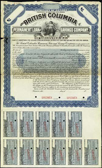 19-- (ca.1908). Specimen bond. "Odd" Pounds Sterling. 4 1/2%. Allegorical woman with plants vignette. Blue border. Red Specimen overprint. Toning in middle of the certificate and edge faults on top. ABNC. Scarce.