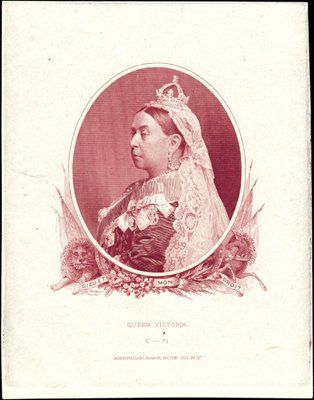 1880's. Proof. Queen Victoria proof vignettes with her facing left. Red; brown and purple. Similar to the vignette on union Bank of Canada, $5.00, P-S1483. Cut down large die proofs. All have imprint and plate number on bottom. Rare vignettes of popular Queen. ABN. Unc.