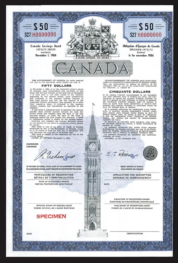 Canada, Ottawa, $50 Canada Savings Bond 1972/73 Series, British arms, Capital Building, blue frame, EF.