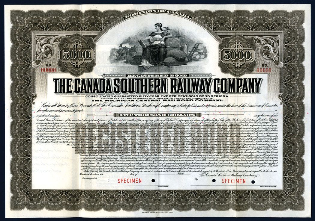 Canada, Consolidated Mortgage, 50 year 5% Registered Gold Bond, Series A, Olive brown border and undertint with portrait of commerce sitting at dock with locomotive and bales of cotton. XF condition.
