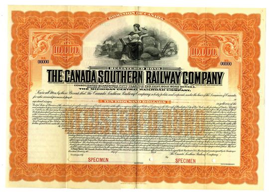 Canada, 1913. $10,000 Specimen 5% Registered Consolidated Gold Bond, Black text with orange border and underprint, Allegorical Commerce seated with sacks at top center. Red specimen overprints, 00000 serial numbers, and POCs. VF condition, ABNC.