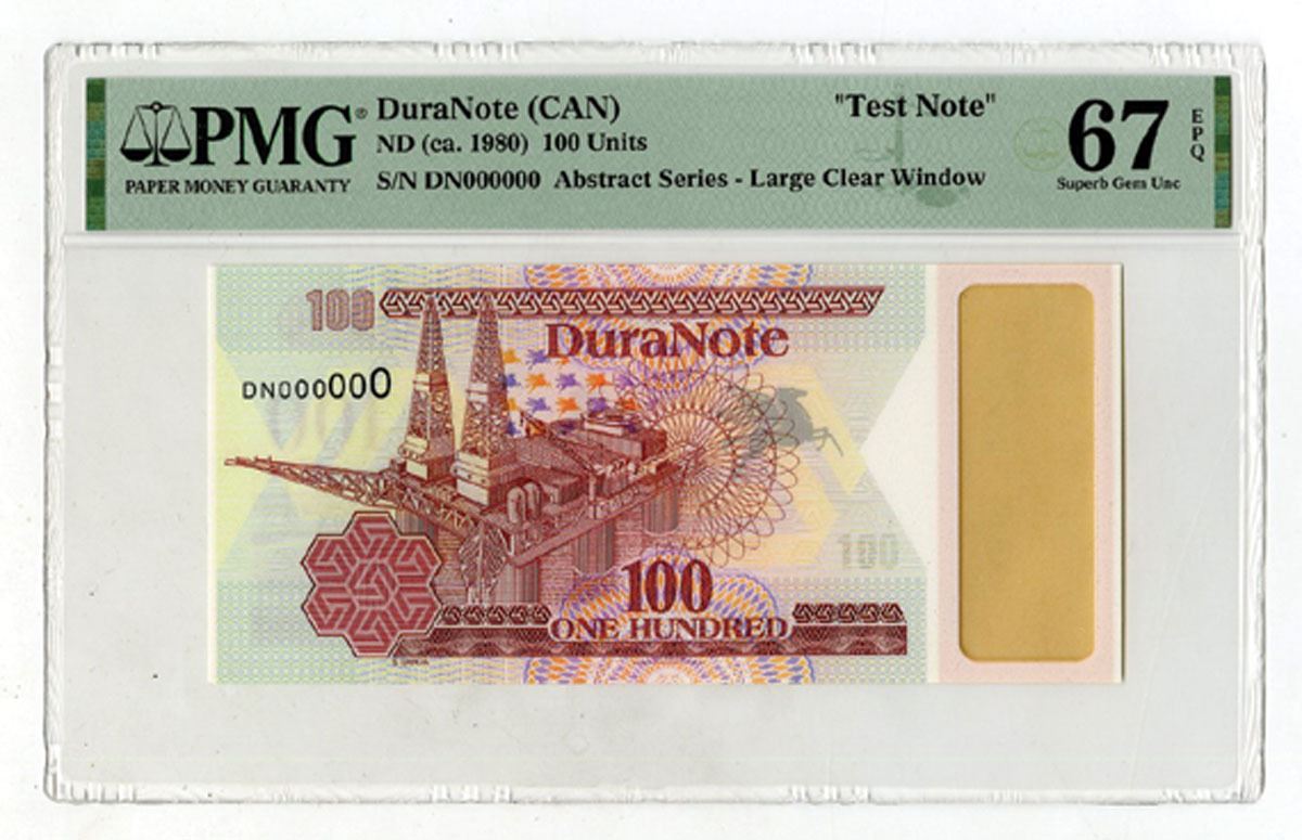 Canada, ND (ca.1980). 100 Units Test Note - Abstract Series - Large Clear Window, S/N DN000000, PMG graded Superb Gem Uncirculated 67 EPQ. DuraNote polymer material was developed as part of a research project by Mobil Oil in the late 1980s to early 1990s. Different countries including the U.S., Canada, England, Venezuela, Mexico and others had there banknotes printed using this material to test it and see if it could be a useful paper alternative. Unfortunately, Mobil Oil merged with Exxon Oil and the project was halted. Banknotes from Canada, Mexico, Venezuela and Great Britain are the only countries that as of now, have examples of their notes printed on this polymer paper, all are extremely rare and desirable.