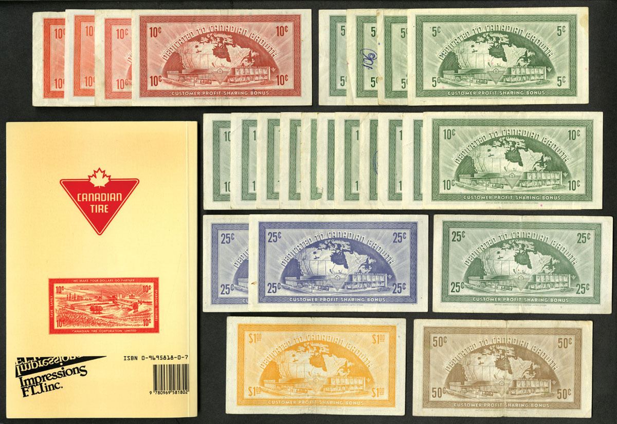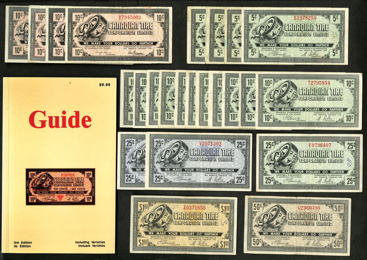 Canada & New York, includes 27 scrip notes. Canada, Canadian Tire Corp, there are 11 different varieties in either denomination, color or signatures of the 5, 10, 25, 50 Cents, 1 Dollar scrip notes, all with the same design. BABNC imprint. Also includes 3 different Sattler-Scrip from Buffalo, New York, in 50 Cents, $1, and $5 denominations, all are in Choice Fine to Choice VF condition. Book is the 3rd edition of the Guide C.T.C. Includes 27 notes plus book.