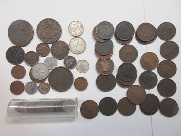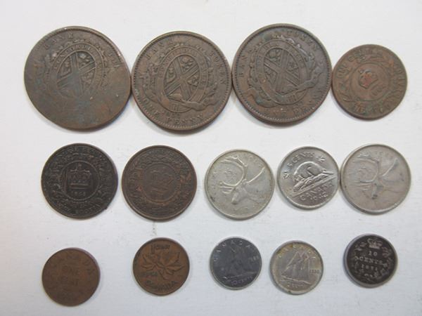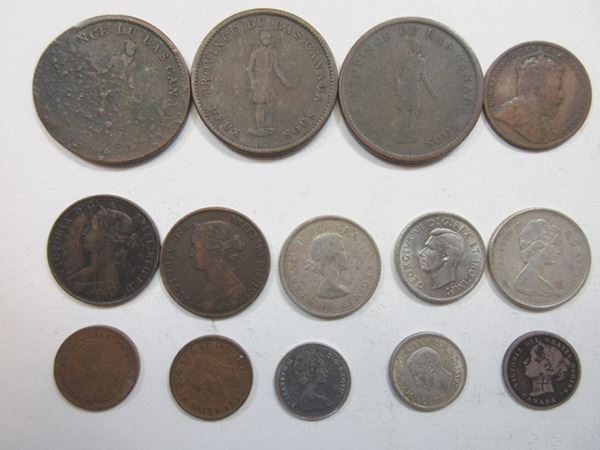 Includes a widely assorted group of Canadian Large Cents (30). A quick glance reveals four 1859 Cents, Fine to EF; 1876 EF and the remaining pieces are averaging VF except for three or four culls. A large group of thirty-seven mostly Victoria silver 5-Cent pieces. Most are Fine, though there are a few culls. The rest of the lot consists of a few silver dimes and quarters, three Nova Scotia Cents, and two Bank Tokens, etc. Should be seen, sold as is.