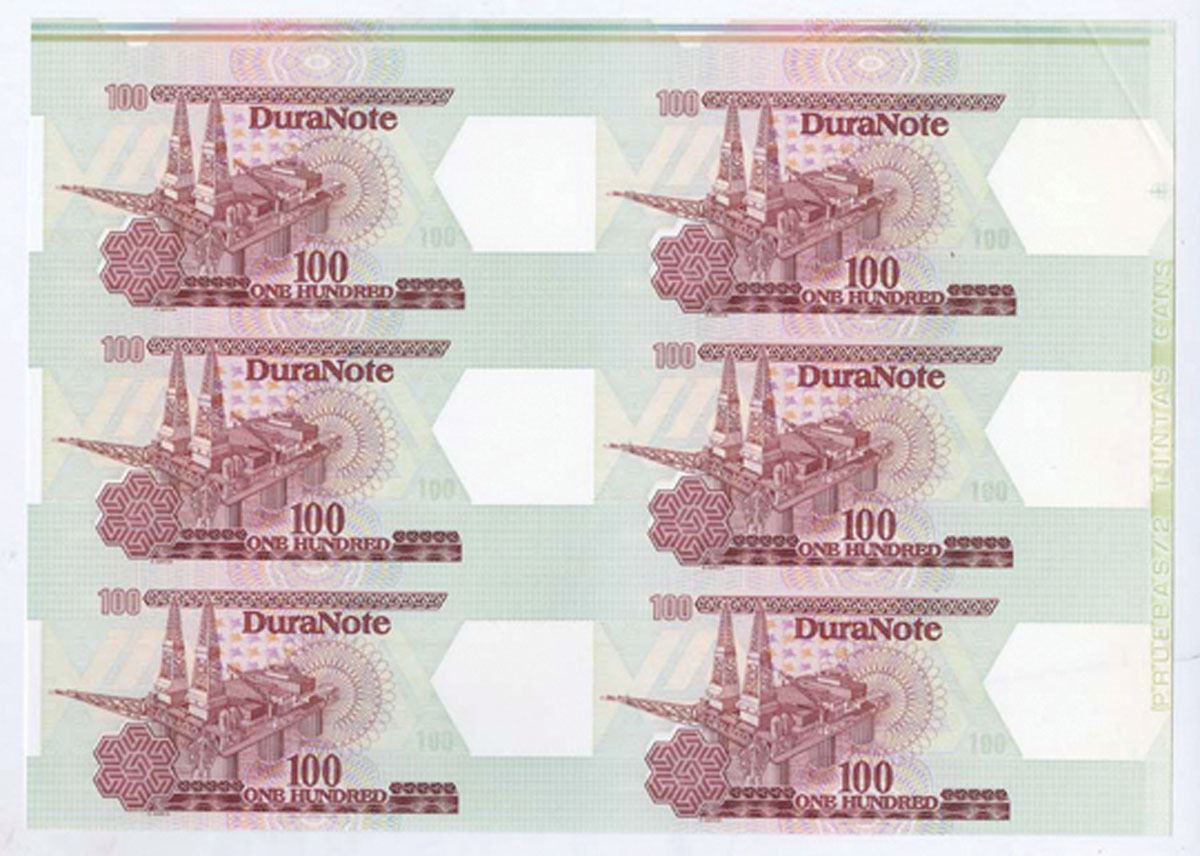 1980-1990's. P-unlisted. 100 Denomination. Uncut block of 6 "Dura" Notes. Polymer banknote material similar to Tyvek but more translucent. Red brown on light green undertint, Ocean oil well drilling platform with ornate designs on front. back with undertint only, Uncirculated to Gem Uncirculated condition. (6 notes on one uncut block).