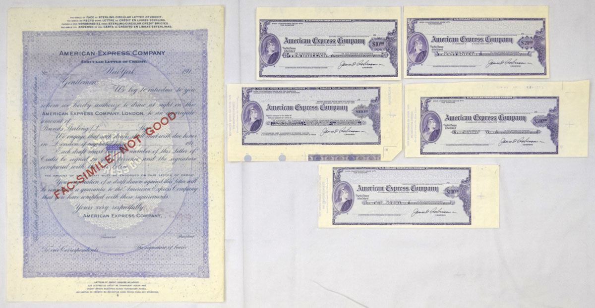 Canada and U.S.,1910-1970s. Lot of 5 Specimen Cheques and 1 Circular Letter of Credit, Includes: U.S. $10, $20, $100, $500; and, $100 Canadian Dollars, All are the same dark blue border and light blue underprint with soldier at left, and all have POC at center; also included is a 191x, large format letter of credit, on one side with the front and back of a large size American Express travelers Check for $20,All are overprinted "Fac-Simile - Not Good" in large letters. All are in AU to CU condition. ABNC. (6). Sold "AS IS" no returns accepted.