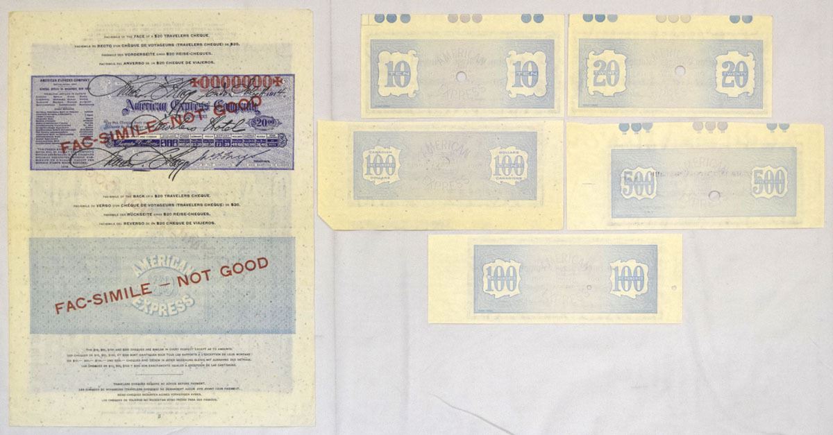 Canada and U.S.,1910-1970s. Lot of 5 Specimen Cheques and 1 Circular Letter of Credit, Includes: U.S. $10, $20, $100, $500; and, $100 Canadian Dollars, All are the same dark blue border and light blue underprint with soldier at left, and all have POC at center; also included is a 191x, large format letter of credit, on one side with the front and back of a large size American Express travelers Check for $20,All are overprinted "Fac-Simile - Not Good" in large letters. All are in AU to CU condition. ABNC. (6). Sold "AS IS" no returns accepted.
