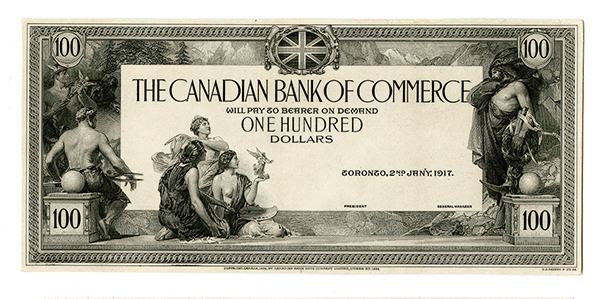 Toronto, Canada.. $100, P-S969p, Progress Proof banknote. Black with out underprint, Allegorical men on left and right with seated women in middle left, AU to Uncirculated, Canadian Bank Note Co.