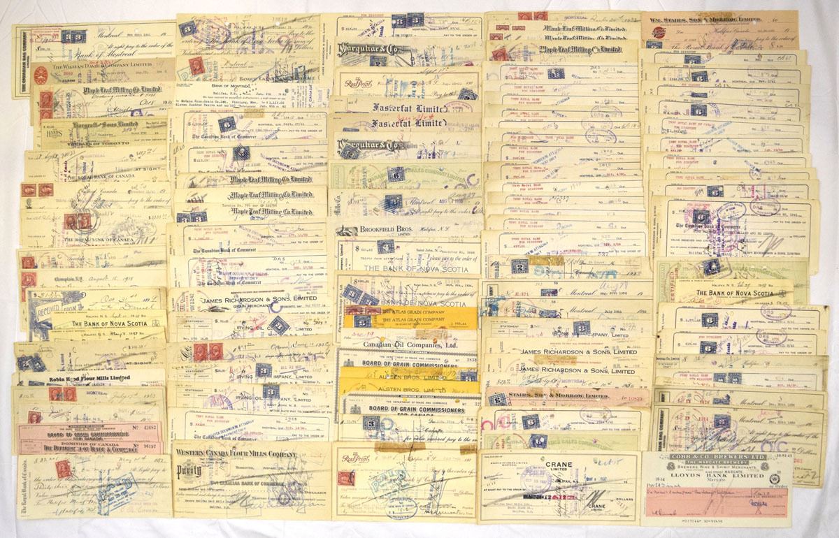 Canada, ca. 1900-40s. Lot of 100+ I/C Canadian bank checks, drafts, and commercial payment documents, representing active business and interbank transactions across multiple provinces. The group includes material drawn on and payable through major Canadian banks and commercial houses, with frequent adhesive revenue stamps, manuscript endorsements, clearing handstamps, and bank processing marks throughout. Issuers and payees span grain companies, milling firms, oil and industrial concerns, merchants, brokers, and exporters, reflecting Canada’s commodity-driven economy during the period. Printed on period check stock in varied formats and colors, many with dense overprinting from repeated handling and clearing. Conditions range from Good to VF overall, with folds, edge wear, ink toning, stamps, and cancellations consistent with genuine commercial use. A visually dense, research-rich accumulation illustrating everyday Canadian banking, trade, and fiscal practices in the first half of the 20th century. (100+). Sold “AS IS” no returns accepted.