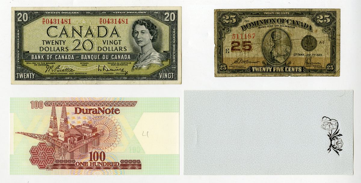 Canada, 1923-ND (1990s). Lot of 4 Notes, Includes: Dominion of Canada, 25 Cents, 1923, P-11b, CBNC; Bank of Canada, 20 Dollars, 1954 (1955-1970), P-80b; Lot also includes Proof DuraNotes - First has oil rig and printed in color, Other note is simple flower. Banknotes range from Fine to Gem Unc. condition. (4). Sold "AS IS" no returns accepted.