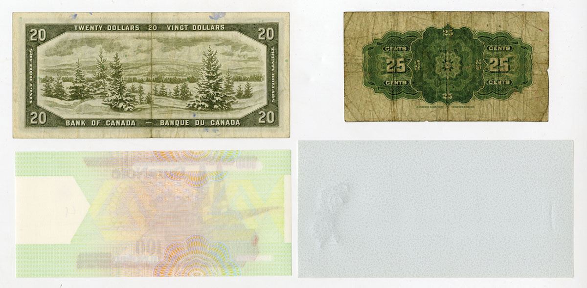 Canada, 1923-ND (1990s). Lot of 4 Notes, Includes: Dominion of Canada, 25 Cents, 1923, P-11b, CBNC; Bank of Canada, 20 Dollars, 1954 (1955-1970), P-80b; Lot also includes Proof DuraNotes - First has oil rig and printed in color, Other note is simple flower. Banknotes range from Fine to Gem Unc. condition. (4). Sold "AS IS" no returns accepted.