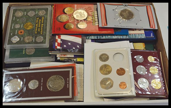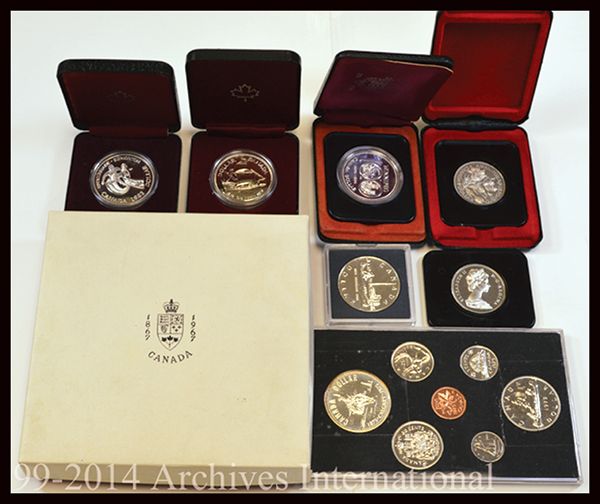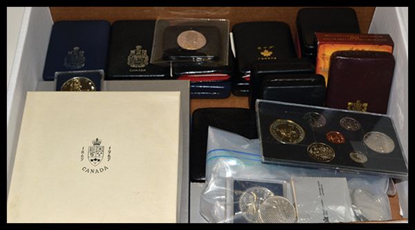 Canadian Dollars, Mostly. 1970 Manitoba(5), 1973 Prince Edward Island, 1974 Winnipeg, 1976 Library of Parliament(2), 1976(2), 1979 Griffin(2), 1982 Regina, 1983 Universiade-Edmonton(6), 1984 Toronto(2), 2000 400th Anniversary, and 2007 Thayendanegea. Also included is a 1975 Two Dollar set, a Canada 1999 & 2000 Millennium nickel set, 1983 Specimen set, 1967 Double Dollar set, and a few other miscellaneous pieces. [30+ sets and singles], weight approximately 7.5 lbs.