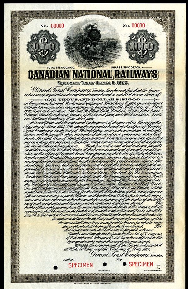 Canada. 1920. $1000 Series E Specimen Bond with coupons attached. Black print with brown border and underprint. Vignette of moving locomotive top center. POC's and red SPECIMEN overprints. VF condition. ABNC. Listed railroad and bond in Cox.