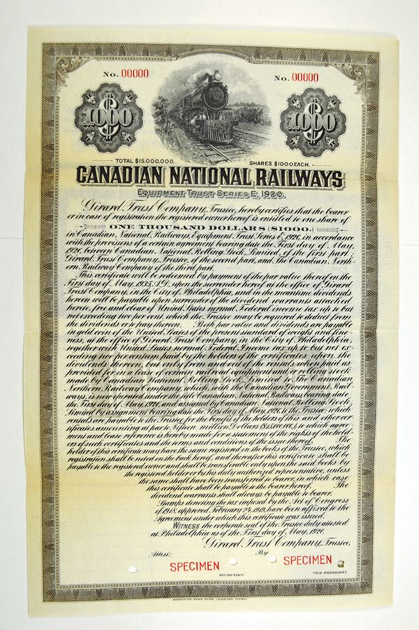 Canada. 1920. $1000 Equipment Trust, Series E, brown frame, Engine vignette, ABNC