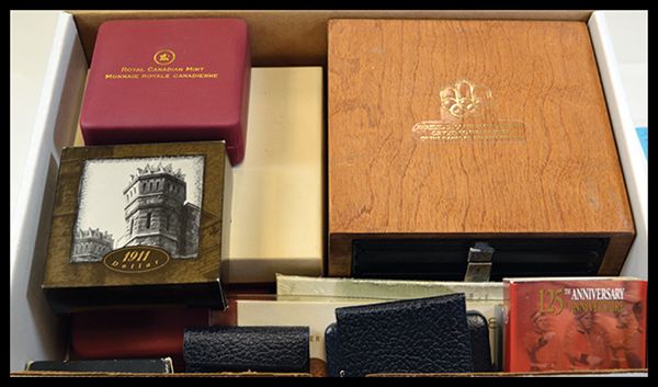 Canadian Olympic Coins and Other Sets and Singles. All seven series of Canadian Olympic coins, Uncirculated, in capsules, in the wooden Co-Sponsorship box; 1967 Double Dollar set; A 2009 Playing Card 1 oz. enameled silver bar; 2005 two-coin Chinese Railway Workers set; 1911-2001 Proof Silver Dollar; 1968 Canadian denomination set; Plus seven other assorted Canadian silver dollars and other pieces. [13 sets and singles], weight approximately 9 lbs.