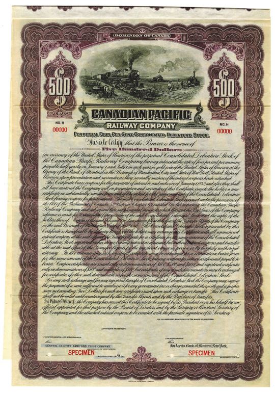 Canada. $500 Specimen 4% Perpetual Consolidated Debenture Coupon Bond, Black print on purple border and under tint, Locomotive passing farmers on one side and repair men on other side, Specimen overprints and POC's, Fine condition with splitting along fold lines and toning over certificate, ABNC.
