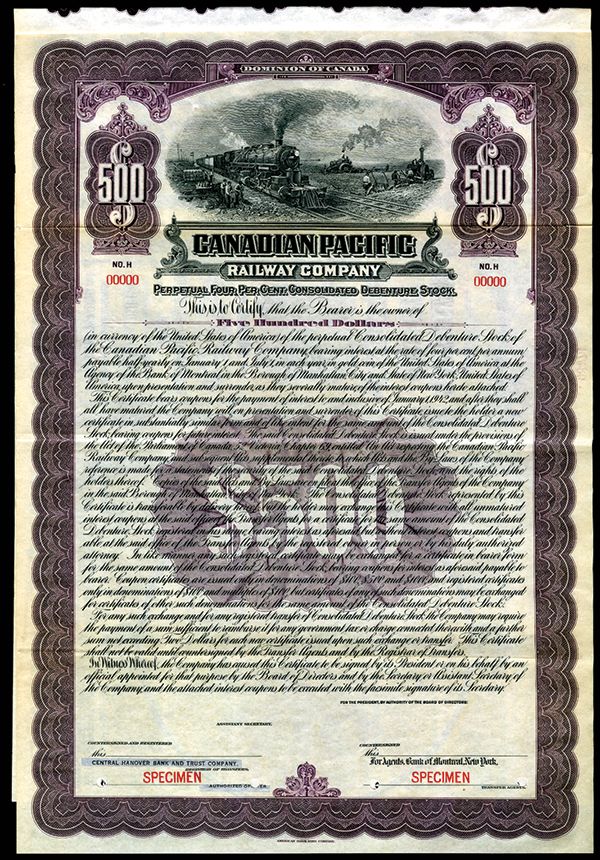Canadian Pacific Railway Co., 1922 Specimen, Perpetual 4% Consolidated Debenture Stock Coupon Bond. Canada, 19xx (ca.1910-1930). $1000. Light purple border and undertint. Locomotive passing track workers with wheat farmers in background. XF condition. Red specimen overprint and POC's. ABNC. Only listed as Specimen in Cox.
