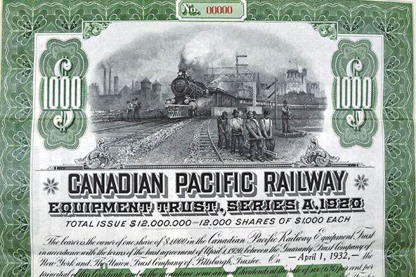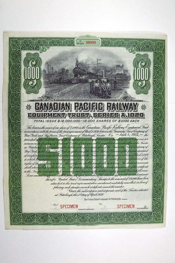 Canada. 1920. $1000 Equipment Trust, Series A, Green frame, Rail yard vignette, ABNC