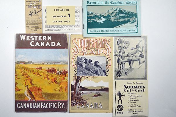 Canadian pacific Western Canada Booklet, 80 pgs; ca1912; Resorts in the Canadian Rockies, 36 pgs; Sportsman Map (CPR), 1907; Santa Fe. Summer Excursions, 1932. Plus Algoma Central Tour ticket and SF passenger baggage receipt. 6 pieces.