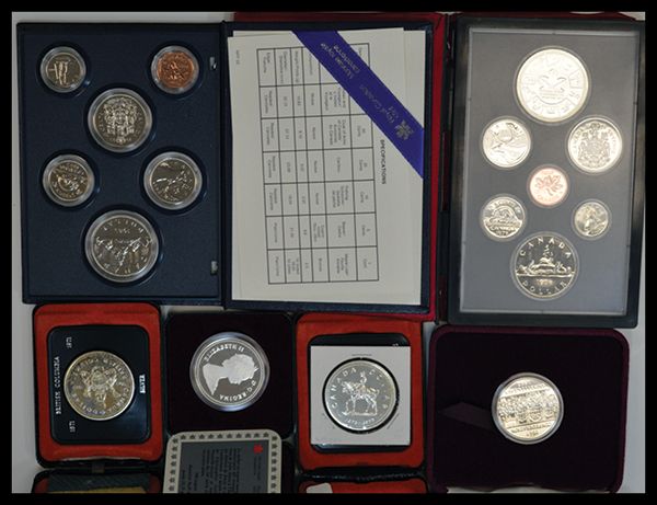 Canadian Prooflike Sets, Dollars and More. Canadian Proof and PL Sets - 1965(3), 1966(2), 1968, 1972 DD, 1974 DD, 1975(2) DD, 1978 DD, 1984 DD, 1985, 1987 DD, 1989(2) DD, 1989 Loon. “Uncirculated” Sets 1974, 1975, 1987(2), 1988(2), 1989, 1992, 1997. Canadian Proof Dollars - 1970 Manitoba, 1971 B. C., 1972, 1973 Mountie, 1974 Winnipeg, 1975 Calvary, 1976 Parliament(3), 1977 Jubilee, 1978 Games, 1982 Constitution(3), 1983 Edmonton, 1984 Toronto(2), 1985 Parks(2), 1986 Vancouver, 1987 Davis Strait, 1988 Forges, 1989 Mackenzie(2), 1990 Kelsey(3), 1991 Frontenac(2). Also included is a Millennium Set, assorted coins from 1992, and others.