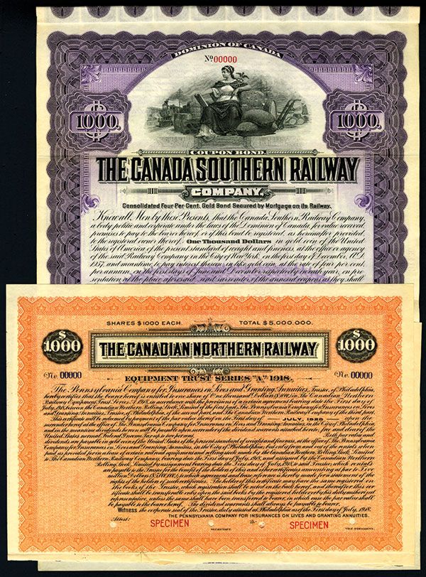 Lot of 2 Canadian railroad specimen bonds. 1)Canadian Northern Railway. 1918. $1000 Equipment Trust Specimen Bond with coupons attached. Black print with orange border and underprint. No vignette. VF condition with splitting at horizontal fold. ABNC. Listed railroad but unlisted bond in Cox. 2)Canadian Southern Railway. 1907. $1000 4% Specimen Bond with coupons attached. Black print with purple border and underprint. Allegorical woman at wharf top center. VF condition. ABNC. Listed railroad but unlisted bond in Cox.