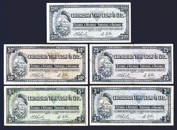 Canada. 3, 5, 25, 50 cents, 1 Dollar. Features "Sandy McTire" at left. Loyalty program currency introduced in 1958. BABNC. Fine or so. 5 pieces.