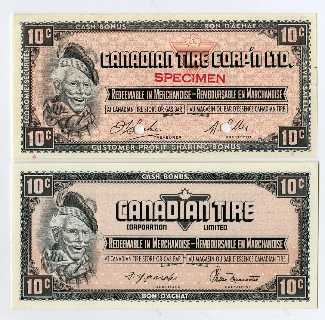 Canada, 1950-60s. Lot of 2 Scrip Notes, Includes: Specimen, 10 Cents by BABNC, Specimen overprints, POC's; and, Issued 10 Cents Certificate. Notes have slight variations of each other with the fictional character "Sandy McTire" he is based on no specific individual but is assumed to represent a thrifty Scotsman, the 1950s everyman of blue-collar Canada. Both are in Choice XF to AU condition. (2). Canadian Tire Corporation, Limited is a Canadian retail company which operates in the automotive, hardware, sports, leisure and housewares sectors. Canadian Tire money, officially Canadian Tire 'money' or CTM, is a loyalty program operated by the Canadian retail chain Canadian Tire. It consists of coupons, issued by the company, which resemble real banknotes. It can be used as scrip in Canadian Tire stores, but is not considered a private currency. The notes are printed on paper similar to what Canadian currency was printed on when they were still paper, and were jointly produced by two of the country's long-established security printers, British American Banknote Company (BABN) and Canadian Bank Note Company (CBN). Some privately owned businesses in Canada accept CTM as payment, since the owners of many such businesses shop at Canadian Tire. In Canadian Tire stores, CTM is accepted for Canadian money at par, i.e.; 1 Canadian Tire Dollar = 1 Canadian Dollar.