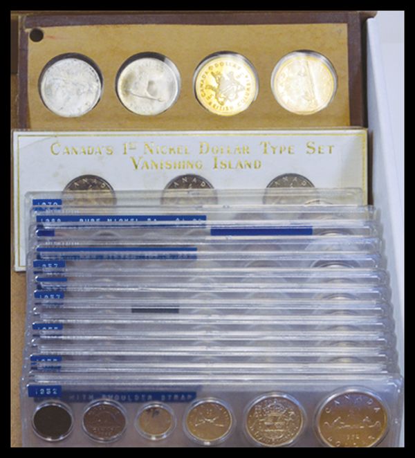 Canadian Year Sets 1949-1970 Canadian Year Sets in Custom Plastic Holders. Each with a cent, nickel, dime, quarter, half dollar, and dollar. 1949, all Choice Uncirculated, PL dollar; 1952 all AU, dollar with water lines; 1953, mostly AU, dollar with shoulder strap, cleaned; 1953, Unc. dollar with no shoulder strap, others AU; 1955 Arnprior, all AU; 1954, all AU; 1955, all AU; 1956, all AU; 1957, dollar with water lines, all Unc; 1957, dollar with one water line, mostly Unc; 1959, mostly Unc; 1968, pure nickel five cent, mostly Unc; 1970, all Unc; 1968 dollars, Type 1, 2 and 3, Unc; plus eight other assorted dollars 1966 to 1976, weight approximately 4 lbs.