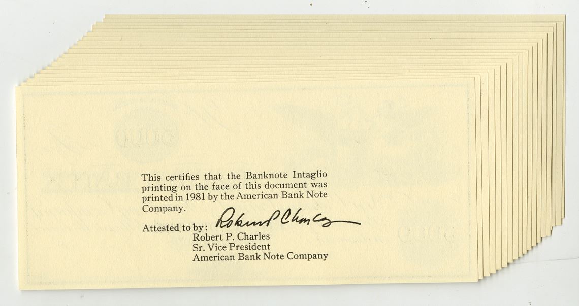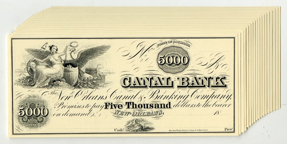 New Orleans, Louisiana, 1848 (1981). $5000, Reprint Banknote, ABNC attestation on the back, CU and better condition. This was used in the American Bank Note Commemoratives Obsolete Banknote Series set and also on the ANA 90th Anniversary Convention of July-August 1981 Souvenir card, but not cut down to banknote size. (19). Sold "AS IS" no returns accepted.