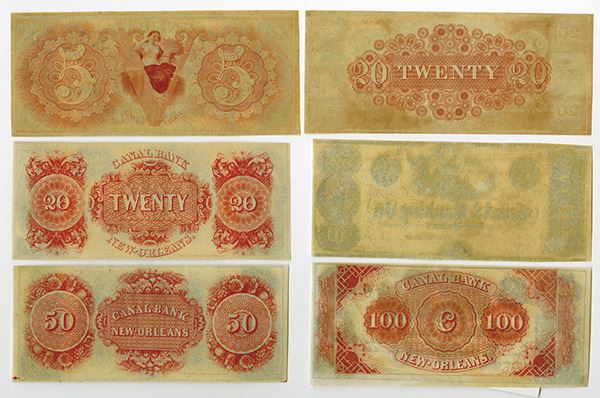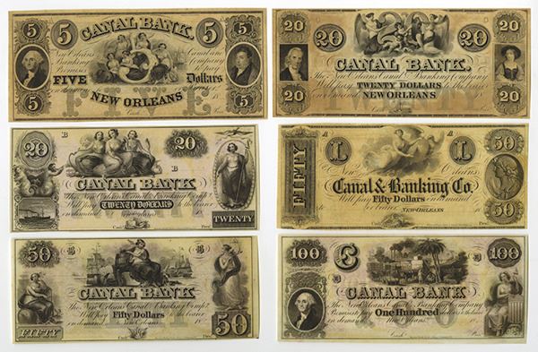 New Orleans, Louisiana, Lot of 6 remainder notes, Includes Toppan Carpenter issues, $5, $20, and $50 banknotes; and RWH&E issues, $20, $50, and $100, all are in Uncirculated to CU condition, a very attractive group, ABNC.