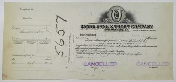 New Orleans, Louisiana, ND (1920-1933). Odd Shares Progress Proof Capital Stock Certificate, No border, Plate cancellation proof, Black text, circular frame at top. Cancelled stamps throughout. VF condition. The Canal Bank & Trust Company went into liquidation in 1933, and was succeeded later that year by the National Bank of Commerce in New Orleans. RBNC