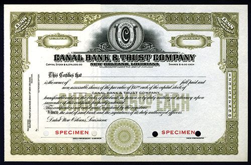 Louisiana, 19xx, Specimen Stock, 100 Shares, Black print on olive border and underprint, Safety Service crest top center, Red SPECIMEN overprints and POC's, VF-XF condition, SBNC.