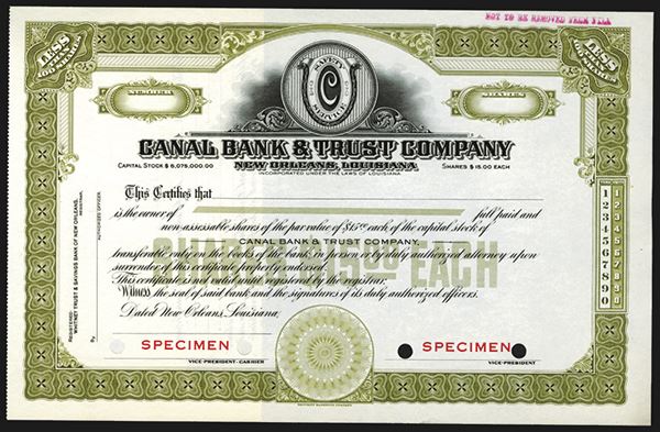 Louisiana, 19xx, Specimen Stock, <100 Shares, Black print on olive border and underprint, Safety Service crest top center, Red SPECIMEN overprints and POC's, VF-XF condition, SBNC.