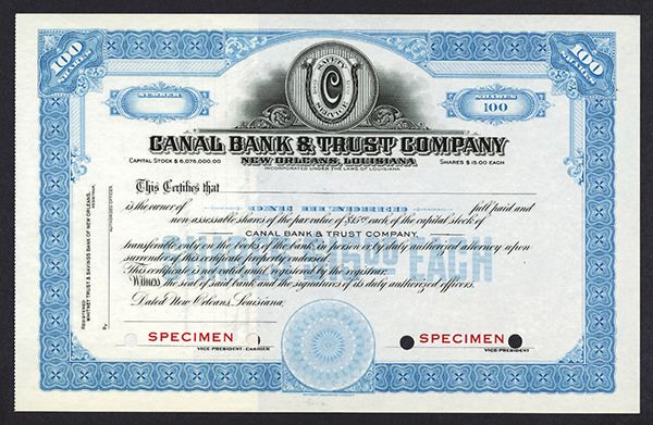 Louisiana, 19xx, Specimen Stock, 100 Shares, Black on light blue border and underprint, Safety Service crest top center, Red SPECIMEN overprints and POC's, VF-XF condition, SBNC.