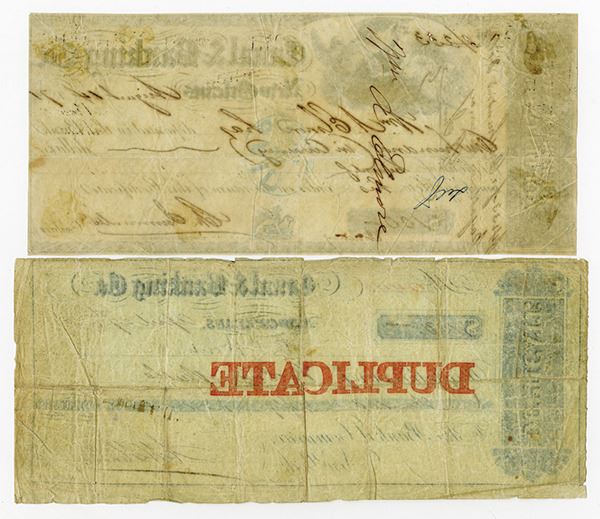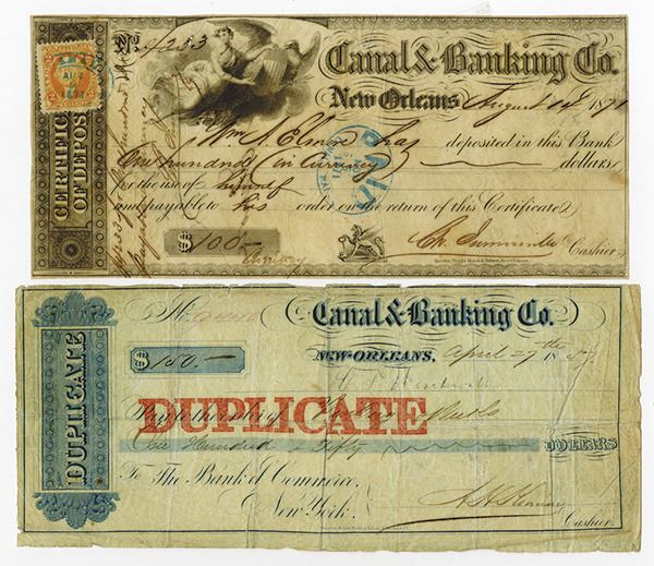 New Orleans, LA. Lot of 2 items, One is an 1857 Duplicate Check, blue with red overprint and the second is a Certificate of Deposit, 1871 with U.S. Adhesive Revenue Stamp but printed on an old form from the 1840's, Fine to VF condition, both by RWH&E.
