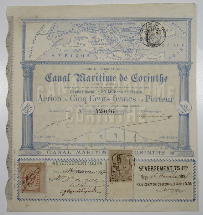 France. Canal Maritime de Corinthe, 1882 I/U Stock Certificate. 500 Francs, Blue with Shipping map and elevation view of canal route. Adhesive revenue stamps on bottom, coupons attached, Very Fine.