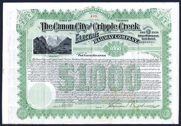 Colorado, 1897, $1000, 5% First Mortgage Gold I/U Bond, #420, Horizontal format, Coupons Attached, Black print on green border and under print, Factory in mountain valley top left, VF condition, J. C. Hammett. Railroad and bond listed in Cox.