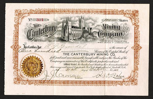 Leadville, Co., 100 Shares, I/U, Black on brown with pink paper, gold foil seal, VF, scarce and very attractive.