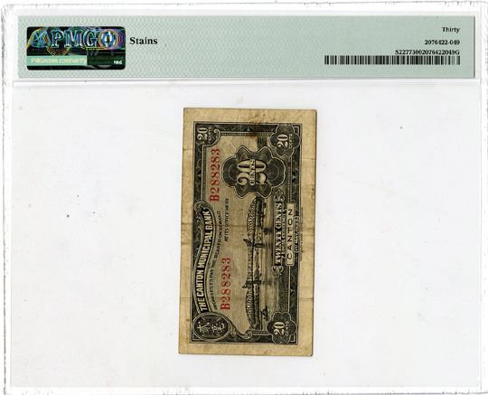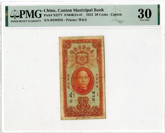 China, 1933. 20 Cents, P-S2277 S/M#K24-41, Issued Banknote, Orange on blue green underprint in vertical formant with SYS at center, Back is brown with bridge at center and in horizontal format, S/N B288283, PMG graded Very Fine 30 with comment "Stains," W&S.