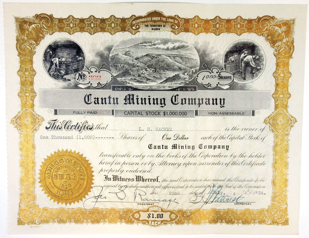 Alaska. I/U stock certificate, 1000 shares, metallic gold border, mountain/miners vignettes, Company seal, XF condition.