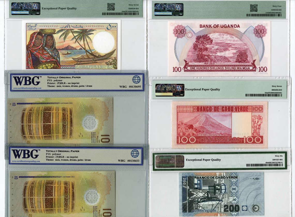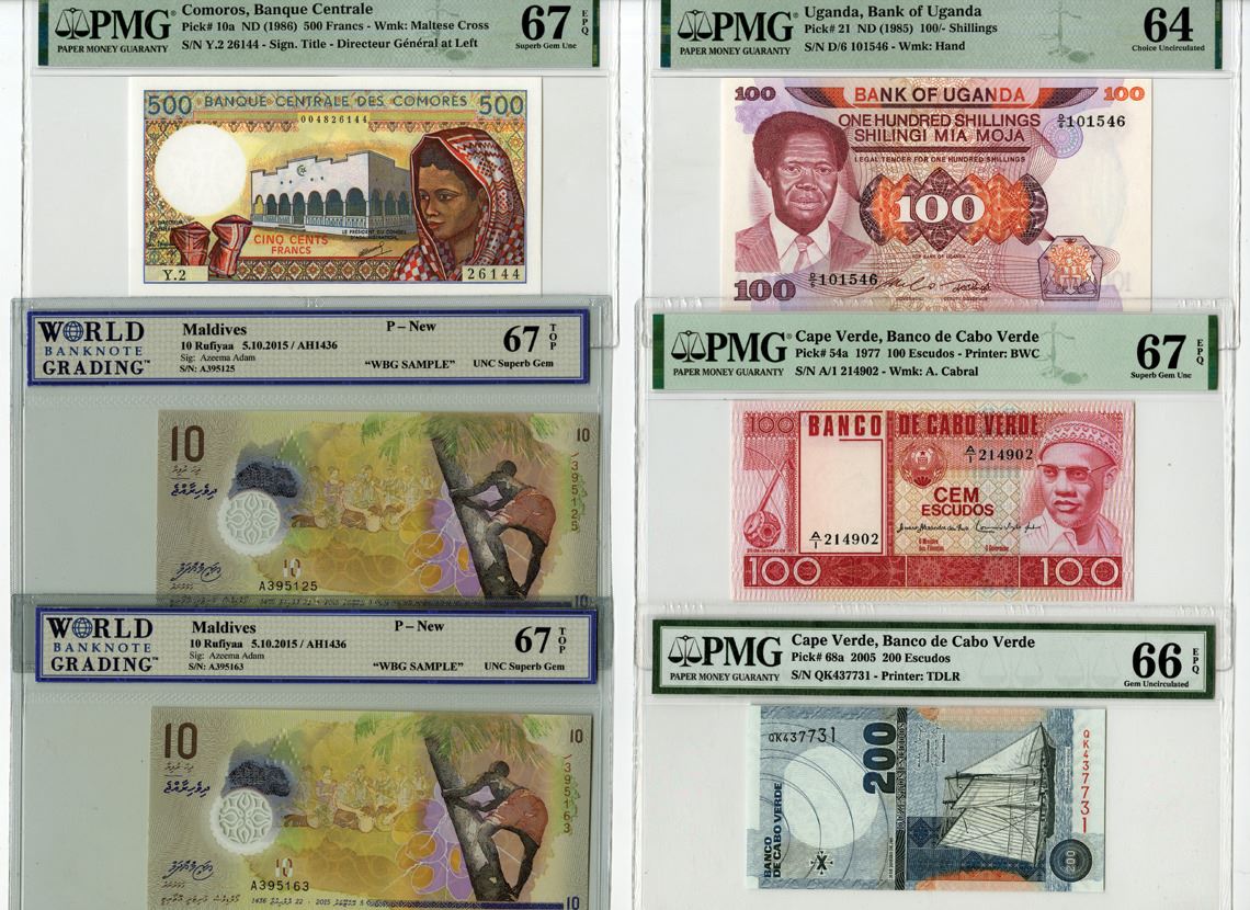 Cape Verde, Comoros, Maldives, & Uganda, 1977-2015. Lot of 6 Issued Banknotes, Includes: Banco de Cabo Verde 100 Escudos, P-84a, 1977, PMG graded Superb Gem Unc 67 EPQ, BWC; 200 Escudos, P-68a, 2005, PMG graded Gem Unc 66 EPQ, TDLR; Banque Centrale des Comores 500 Francs, P-10a, ND (1986), PMG graded Superb Gem Uncirculated 67 EPQ; Maldives Monetary Authority 10 Rufiyaa, P-26 (2), 2015, WBG graded UNC Superb Gem 67 TOP, TDLR; Bank of Uganda 100 Shillings, P-21, ND (1985), PMG graded Choice Uncirculated 64. (6). Sold "AS IS" no returns accepted.