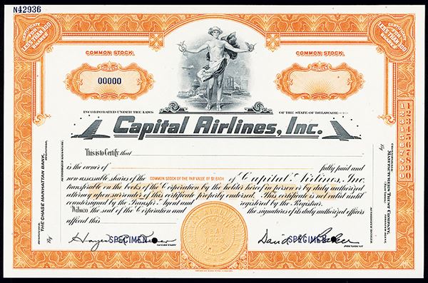Delaware, 1948 (1950-60's) Specimen Stock, Black on orange border and underprint, Mercury standing top center holding a caduceus in right and hand and winged wheel in left with U.S. capitol building and large city behind him, VF condition, ABNC. Rare modern aviation stock certificate.
