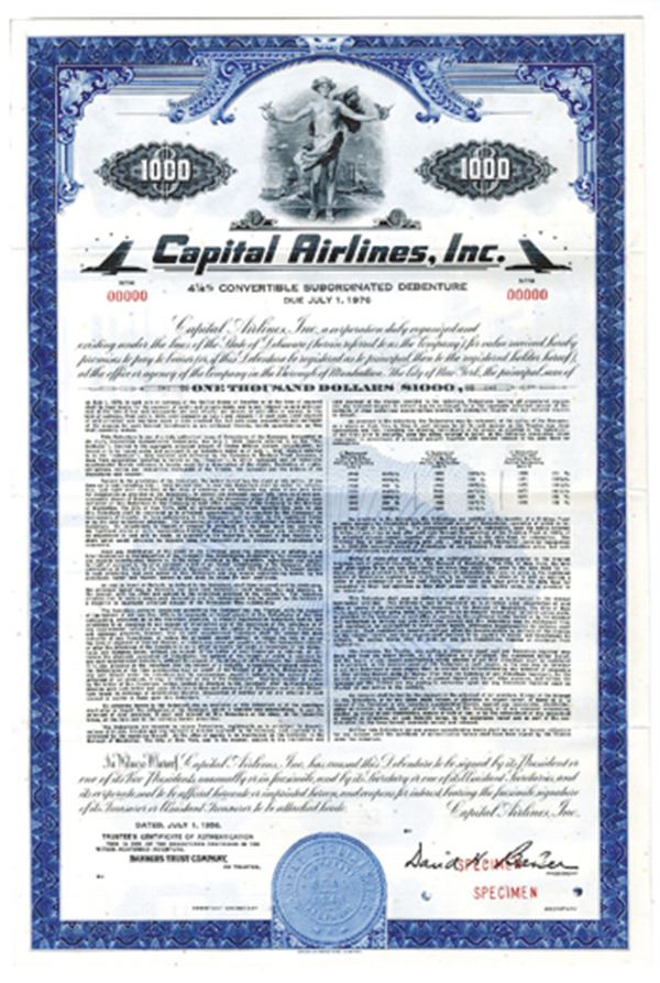 Delaware. $1000 Specimen 4 1/4% Convertible Subordinated Debenture Coupon Bond, Black print on blue border and under tint, Allegorical figure at top with airplanes around him, Specimen overprints and POC's, VF-XF condition, ABNC.